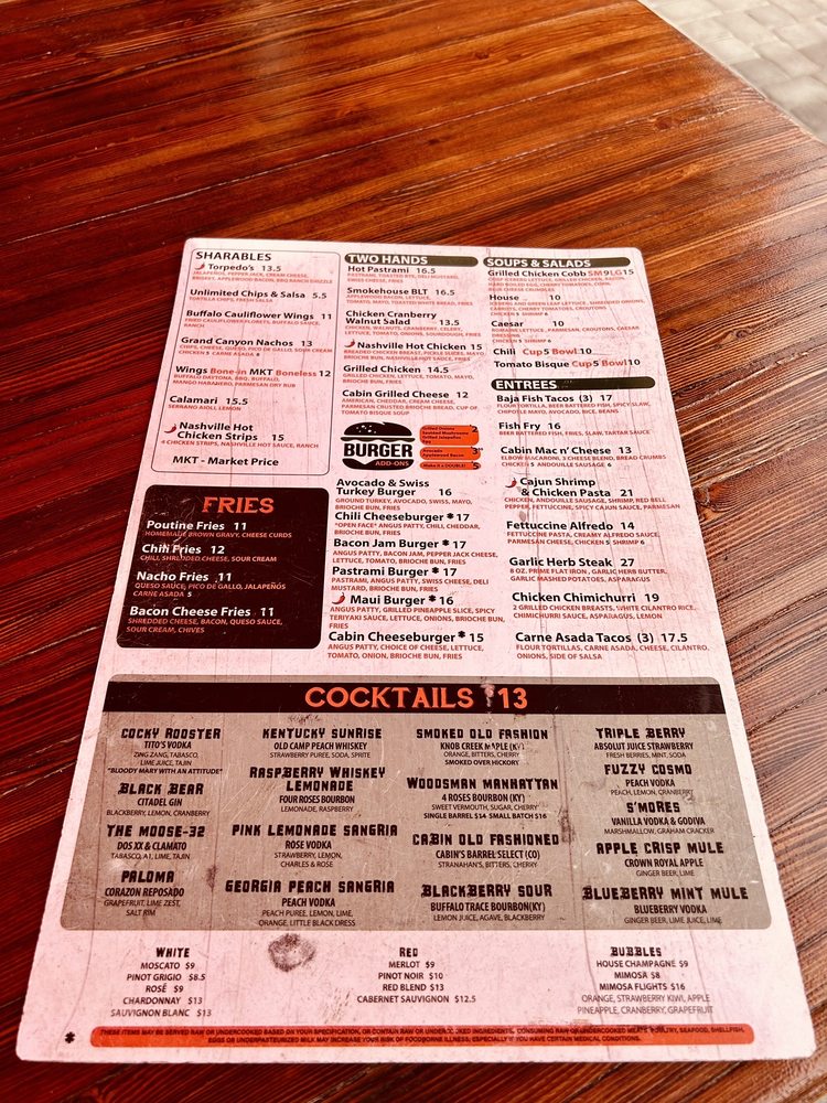 Cabin Whiskey & Grill, located in Peoria, AZ, offers a unique American dining experience with a wide range of amenities. From brunch starters like Bacon Skewers and Tater Tot Skewers to delicious Waffles and Brunch Plates, the menu is diverse and satisfying. Customers rave about the fresh food and friendly service, making it a great spot for lunch or dinner. The ambiance is lively, perfect for sports enthusiasts with Happy Hour specials and a full bar. Outdoor seating, private parking, and a dog-friendly policy add to the appeal. Highlights include the zesty Fish Tacos, flavorful torpedos, and crispy sweet potato fries. Whether you're craving a classic burger or want to try something new like the blackberry sour cocktail, Cabin Whiskey & Grill is a must-visit destination for a fun and delicious dining experience.